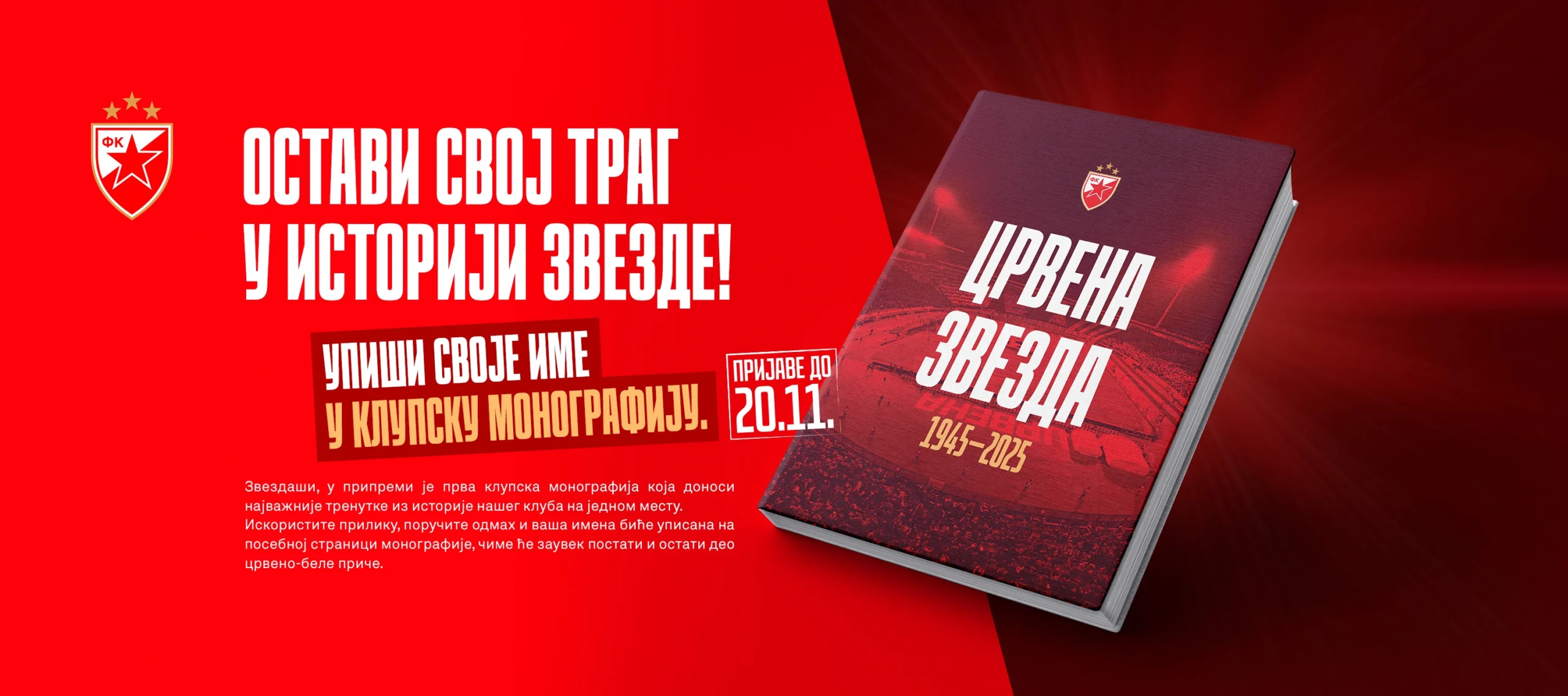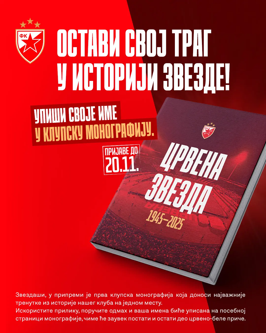 Искориститe прилику, поручите одмах и ваша имена биће уписана на посебној страници монографије, чиме ће заувек постати и остати део црвено-беле приче.